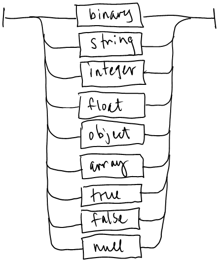 A value can be binary, a string, an integer, a float, an object, an array, true (t) or false (f) or null (~).