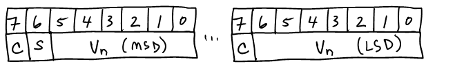 And finally, set the sign bit (S) to 0 to indicate a positive value and the continuation bit of each byte (C) except the last to 1: